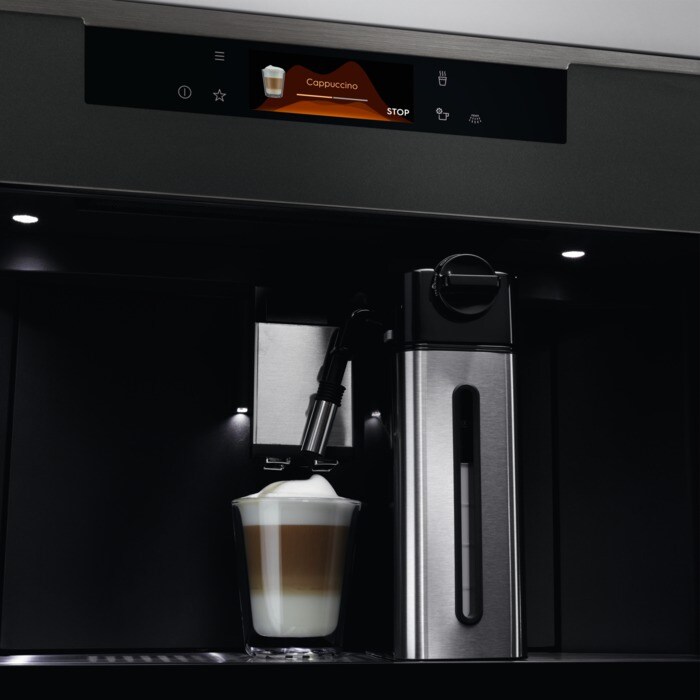 – Köögisalongi mudel. – Matt Must stiilne integreeritav kohvimasin. – Teie kodune barista ehk kohvibaarmen – Lihtsasti reguleeritav kohvikangus – Valmistage täiuslik cappuccino piimakoguse funktsiooni abil – Kohvikustiilis cappuccino, millal iganes soovite – Värviline TFT ekraan – Matt must klaas