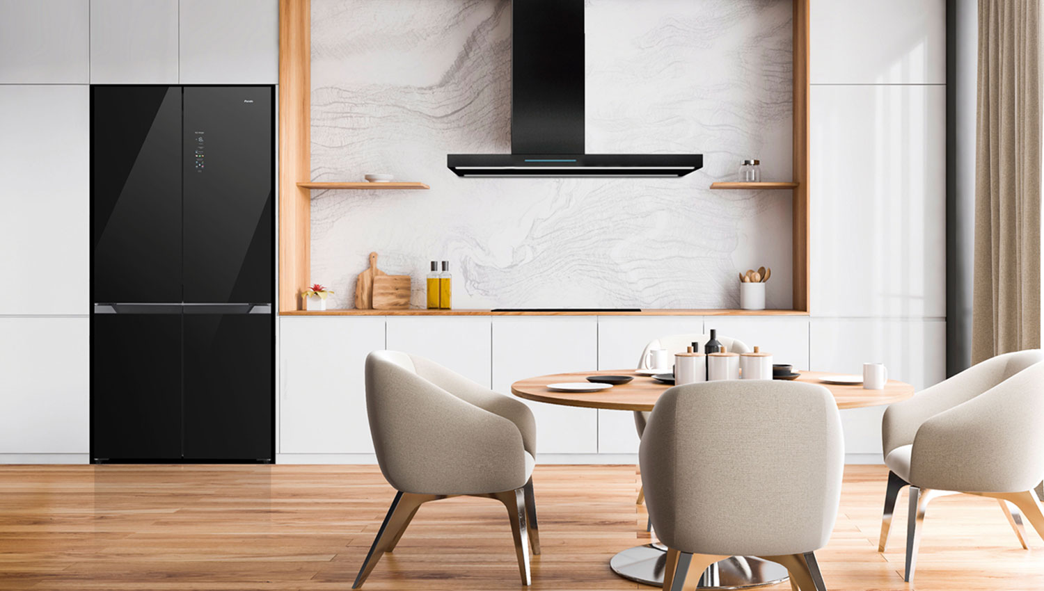 Nelja uksega Ameerika külmik musta klaasviimistlusega ja vähendatud sügavusega (597 mm), mis võimaldab selle ideaalse paigalduse mööbliga ühele joonele.