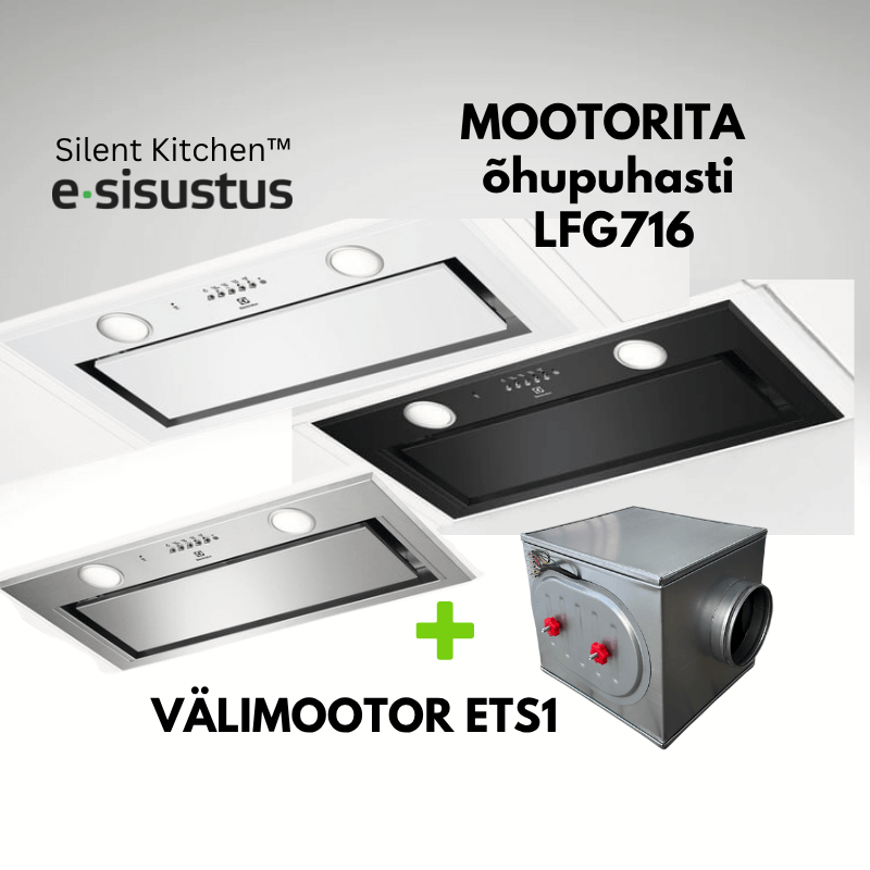 – KOMPLEKT: Eesti kõige populaarsem õhupuhasti Electrolux LFG716i + E-sisustus välimootor ETS1 – Võimalik valida õhupuhasti värvi (must, valge või roostevaba) – Väike energiakulu, suur võimsus, vaikne – Hob2Hood – automaatne õhupuhasti võimsuse juhtimine. Toiduvalmistamise ajal kohandatakse ventilaatori kiirust vastavalt pliidiplaadi temperatuuri muutumisele või täiendava keeduala sisselülitamisele.