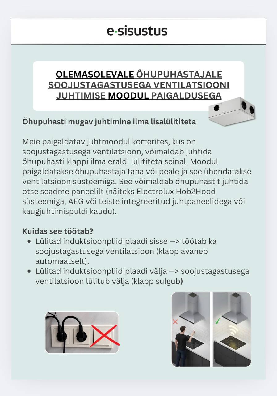 • Vt meie Vaikse Köögi õhupuhasti erilahendusi mida soovitame sundventialatsiooniga kasutamiseks: https://pood.e-sisustus.ee/tootesilt/soojustagastus/